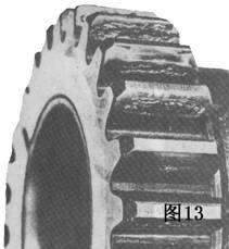 圖18是齒輪的典型疲勞缺陷,其特點(diǎn)是有光滑的地方.它是由重的載荷或震動(dòng)載荷(不正確的換檔和操縱離合器)造成的。